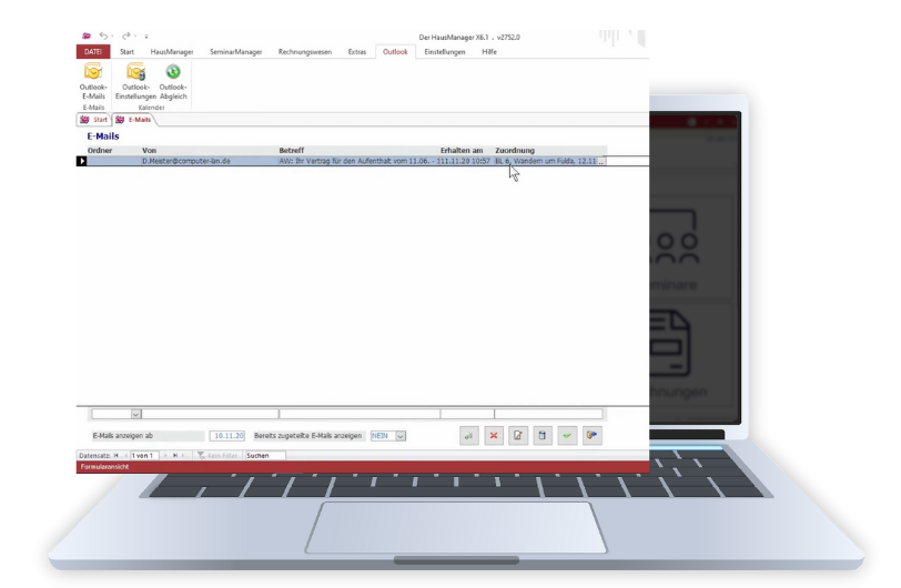 Mit der Outlook-Schnittstelle wird dein E-Mail-Verkehr aus Outlook direkt in den Haus- und AkademieManager eingebunden: