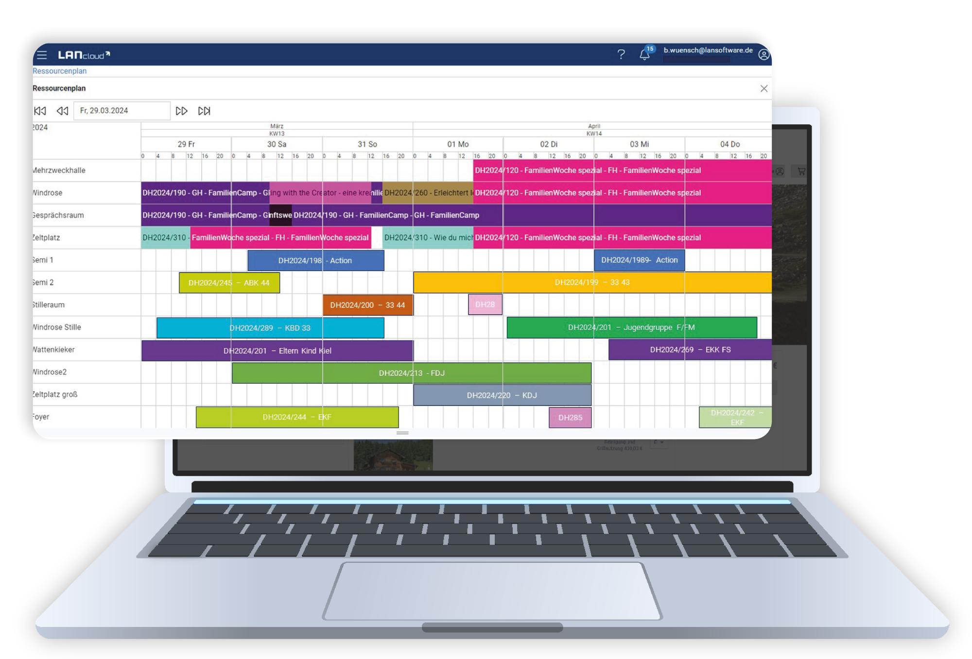 Der Ressourcenplan von LANcloud bietet dir eine effiziente Möglichkeit, deine Ressourcen optimal auf die geplanten Termine abzustimmen. Dieses hilfreiche Tool, bekannt aus dem Haus- und AkademieManager, ermöglicht dir einen klaren Überblick über all deine bevorstehenden Veranstaltungen zu behalten.
