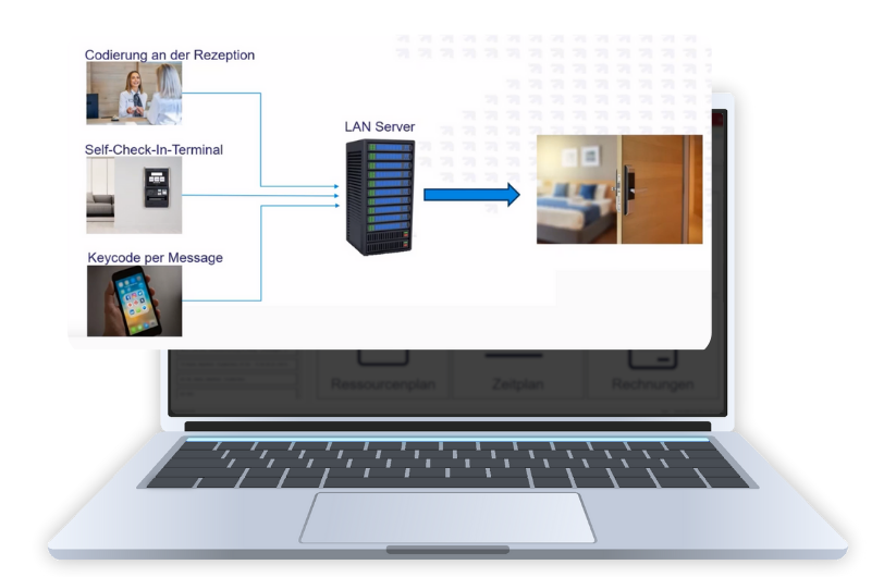Die Schnittstelle ermöglicht dir die vollständige Verwaltung von Zugangsmedien wie programmierbaren Schlüsselkarten oder digitalen Zutrittscodes. Zimmer, Tagungsräume, Nebenräume oder andere Ressourcen kannst du einfach aus der Software heraus freigeben und verwalten.
